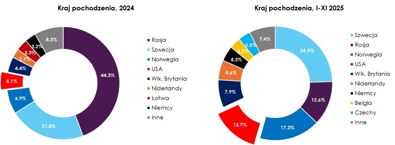 Po 11 miesiącach 2025 r. udział gazu rosyjskiego w strukturze importu LPG do Polski wynosił niespełna 13%. Największym dostawcą pozostaje Szwecja z udziałem ok. 25% przed Norwegią (17%) i Stanami Zjednoczonymi (14%), które w ciągu minionego roku awansowały na trzecie miejsce. W tym samym okresie terminale morskie przejęły dominującą rolę w zaopatrzeniu rynku krajowego, zastępując dostawy kolejowe. Ich udział w imporcie gazu płynnego do Polski wzrósł z 29% w 2024 r. do 57% w 2025 r. W ciągu roku Polska odwróciła się od wschodu i zwróciła ku Bałtykowi.